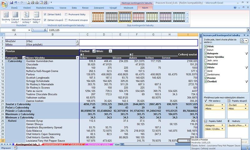 Jakmile jsou všechna data propojená, můžete vytvořit jedinou kontingenční tabulku, která využívá data z různých „tabulek“ v modelu. Tento přístup je výhodný, protože zachovává logické oddělení dat a umožňuje sofistikované analýzy, např. agregaci prodeje z různých oblastí podle regionu nebo období, přičemž zdrojová data zůstávají na původních listech.